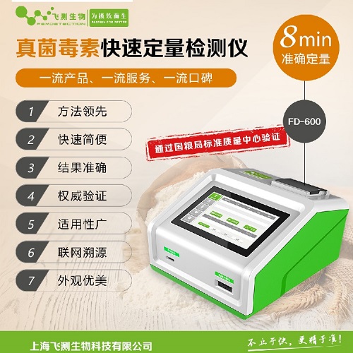 FD-600型真菌毒素快速檢測儀可一機多用,同時檢測糧油飼料領(lǐng)域多個系列項目,包括真菌毒素系列、重金屬系列、農(nóng)藥殘留寫了、轉(zhuǎn)基因系列等,并可無限生機,增加后續(xù)開發(fā)的其他系列項目;儀器外觀優(yōu)雅,穩(wěn)定可靠,操作簡便,采用內(nèi)置定量技術(shù),自動計算檢測結(jié)果。檢測結(jié)果可實時上傳溯源管理平臺,儀器端、電腦端、移動端同步共享,實現(xiàn)檢測結(jié)果的自動分析,全過程質(zhì)量控制,數(shù)據(jù)可共享,食品安全溯源,大數(shù)據(jù)分析等功能。